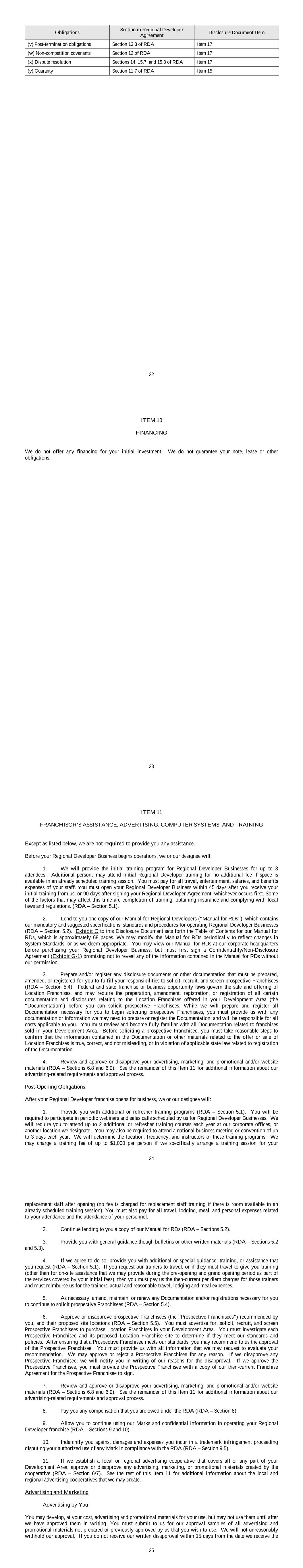 22 Obligations Section in Regional Developer Agreement Disclosure Document Item (v) Post-termination obligations Section 13.3 of RDA Item 17 (w) Non-competition covenants Section 12 of RDA Item 17 (x) Dispute resolution Sections 14, 15.7, and 15.8 of RDA Item 17 (y) Guaranty Section 11.7 of RDA Item 15 23 ITEM 10 FINANCING We do not offer any financing for your initial investment. We do not guarantee your note, lease or other obligations. 24 ITEM 11 FRANCHISOR’S ASSISTANCE, ADVERTISING, COMPUTER SYSTEMS, AND TRAINING Except as listed below, we are not required to provide you any assistance. Before your Regional Developer Business begins operations, we or our designee will: 1. We will provide the initial training program for Regional Developer Businesses for up to 3 attendees. Additional persons may attend initial Regional Developer training for no additional fee if space is available in an already scheduled training session. You must pay for all travel, entertainment, salaries, and benefits expenses of your staff. You must open your Regional Developer Business within 45 days after you receive your initial training from us, or 90 days after signing your Regional Developer Agreement, whichever occurs first. Some of the factors that may affect this time are completion of training, obtaining insurance and complying with local laws and regulations. (RDA – Section 5.1). 2. Lend to you one copy of our Manual for Regional Developers (“Manual for RDs”), which contains our mandatory and suggested specifications, standards and procedures for operating Regional Developer Businesses (RDA – Section 5.2). Exhibit C to this Disclosure Document sets forth the Table of Contents for our Manual for RDs, which is approximately 68 pages. We may modify the Manual for RDs periodically to reflect changes in System Standards, or as we deem appropriate. You may view our Manual for RDs at our corporate headquarters before purchasing your Regional Developer Business, but must first sign a Confidentiality/Non-Disclosure Agreement (Exhibit G-1) promising not to reveal any of the information contained in the Manual for RDs without our permission. 3. Prepare and/or register any disclosure documents or other documentation that must be prepared, amended, or registered for you to fulfill your responsibilities to solicit, recruit, and screen prospective Franchisees (RDA – Section 5.4). Federal and state franchise or business opportunity laws govern the sale and offering of Location Franchises, and may require the preparation, amendment, registration, or registration of all certain documentation and disclosures relating to the Location Franchises offered in your Development Area (the “Documentation”) before you can solicit prospective Franchisees. While we will prepare and register all Documentation necessary for you to begin soliciting prospective Franchisees, you must provide us with any documentation or information we may need to prepare or register the Documentation, and will be responsible for all costs applicable to you. You must review and become fully familiar with all Documentation related to franchises sold in your Development Area. Before soliciting a prospective Franchisee, you must take reasonable steps to confirm that the information contained in the Documentation or other materials related to the offer or sale of Location Franchises is true, correct, and not misleading, or in violation of applicable state law related to registration of the Documentation. 4. Review and approve or disapprove your advertising, marketing, and promotional and/or website materials (RDA – Sections 6.8 and 6.9). See the remainder of this Item 11 for additional information about our advertising-related requirements and approval process. Post-Opening Obligations: After your Regional Developer franchise opens for business, we or our designee will: 1. Provide you with additional or refresher training programs (RDA – Section 5.1). You will be required to participate in periodic webinars and sales calls scheduled by us for Regional Developer Businesses. We will require you to attend up to 2 additional or refresher training courses each year at our corporate offices, or another location we designate. You may also be required to attend a national business meeting or convention of up to 3 days each year. We will determine the location, frequency, and instructors of these training programs. We may charge a training fee of up to $1,000 per person if we specifically arrange a training session for your 25 replacement staff after opening (no fee is charged for replacement staff training if there is room available in an already scheduled training session). You must also pay for all travel, lodging, meal, and personal expenses related to your attendance and the attendance of your personnel. 2. Continue lending to you a copy of our Manual for RDs (RDA – Sections 5.2). 3. Provide you with general guidance though bulletins or other written materials (RDA – Sections 5.2 and 5.3). 4. If we agree to do so, provide you with additional or special guidance, training, or assistance that you request (RDA – Section 5.1). If you request our trainers to travel, or if they must travel to give you training (other than for on-site assistance that we may provide during the pre-opening and grand opening period as part of the services covered by your initial fees), then you must pay us the then-current per diem charges for those trainers and must reimburse us for the trainers' actual and reasonable travel, lodging and meal expenses. 5. As necessary, amend, maintain, or renew any Documentation and/or registrations necessary for you to continue to solicit prospective Franchisees (RDA – Section 5.4). 6. Approve or disapprove prospective Franchisees (the “Prospective Franchisees”) recommended by you, and their proposed site locations (RDA – Section 5.5). You must advertise for, solicit, recruit, and screen Prospective Franchisees to purchas