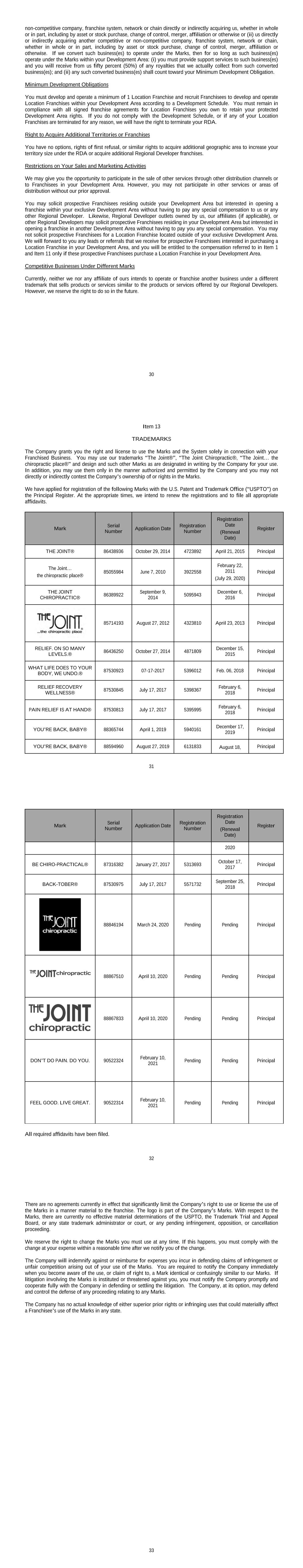 30 non-competitive company, franchise system, network or chain directly or indirectly acquiring us, whether in whole or in part, including by asset or stock purchase, change of control, merger, affiliation or otherwise or (ii) us directly or indirectly acquiring another competitive or non-competitive company, franchise system, network or chain, whether in whole or in part, including by asset or stock purchase, change of control, merger, affiliation or otherwise. If we convert such business(es) to operate under the Marks, then for so long as such business(es) operate under the Marks within your Development Area: (i) you must provide support services to such business(es) and you will receive from us fifty percent (50%) of any royalties that we actually collect from such converted business(es); and (ii) any such converted business(es) shall count toward your Minimum Development Obligation. Minimum Development Obligations You must develop and operate a minimum of 1 Location Franchise and recruit Franchisees to develop and operate Location Franchises within your Development Area according to a Development Schedule. You must remain in compliance with all signed franchise agreements for Location Franchises you own to retain your protected Development Area rights. If you do not comply with the Development Schedule, or if any of your Location Franchises are terminated for any reason, we will have the right to terminate your RDA. Right to Acquire Additional Territories or Franchises You have no options, rights of first refusal, or similar rights to acquire additional geographic area to increase your territory size under the RDA or acquire additional Regional Developer franchises. Restrictions on Your Sales and Marketing Activities We may give you the opportunity to participate in the sale of other services through other distribution channels or to Franchisees in your Development Area. However, you may not participate in other services or areas of distribution without our prior approval. You may solicit prospective Franchisees residing outside your Development Area but interested in opening a franchise within your exclusive Development Area without having to pay any special compensation to us or any other Regional Developer. Likewise, Regional Developer outlets owned by us, our affiliates (if applicable), or other Regional Developers may solicit prospective Franchisees residing in your Development Area but interested in opening a franchise in another Development Area without having to pay you any special compensation. You may not solicit prospective Franchisees for a Location Franchise located outside of your exclusive Development Area. We will forward to you any leads or referrals that we receive for prospective Franchisees interested in purchasing a Location Franchise in your Development Area, and you will be entitled to the compensation referred to in Item 1 and Item 11 only if these prospective Franchisees purchase a Location Franchise in your Development Area. Competitive Businesses Under Different Marks Currently, neither we nor any affiliate of ours intends to operate or franchise another business under a different trademark that sells products or services similar to the products or services offered by our Regional Developers. However, we reserve the right to do so in the future. 31 Item 13 TRADEMARKS The Company grants you the right and license to use the Marks and the System solely in connection with your Franchised Business. You may use our trademarks “The Joint®”, “The Joint Chiropractic®, “The Joint… the chiropractic place®” and design and such other Marks as are designated in writing by the Company for your use. In addition, you may use them only in the manner authorized and permitted by the Company and you may not directly or indirectly contest the Company’s ownership of or rights in the Marks. We have applied for registration of the following Marks with the U.S. Patent and Trademark Office (“USPTO”) on the Principal Register. At the appropriate times, we intend to renew the registrations and to file all appropriate affidavits. Mark Serial Number Application Date Registration Number Registration Date (Renewal Date) Register THE JOINT® 86438936 October 29, 2014 4723892 April 21, 2015 Principal The Joint… the chiropractic place® 85055984 June 7, 2010 3922558 February 22, 2011 (July 29, 2020) Principal THE JOINT CHIROPRACTIC® 86389922 September 9, 2014 5095943 December 6, 2016 Principal 85714193 August 27, 2012 4323810 April 23, 2013 Principal RELIEF. ON SO MANY LEVELS.® 86436250 October 27, 2014 4871809 December 15, 2015 Principal WHAT LIFE DOES TO YOUR BODY, WE UNDO.® 87530923 07-17-2017 5396012 Feb. 06, 2018 Principal RELIEF RECOVERY WELLNESS® 87530845 July 17, 2017 5398367 February 6, 2018 Principal PAIN RELIEF IS AT HAND® 87530813 July 17, 2017 5395995 February 6, 2018 Principal YOU’RE BACK, BABY® 88365744 April 1, 2019 5940161 December 17, 2019 Principal YOU’RE BACK, BABY® 88594960 August 27, 2019 6131833 August 18, Principal 32 Mark Serial Number Application Date Registration Number Registration Date (Renewal Date) Register 2020 BE CHIRO-PRACTICAL® 87316382 January 27, 2017 5313693 October 17, 2017 Principal BACK-TOBER® 87530975 July 17, 2017 5571732 September 25, 2018 Principal 88846194 March 24, 2020 Pending Pending Principal 88867510 April 10, 2020 Pending Pending Principal 88867833 April 10, 2020 Pending Pending Principal DON’T DO PAIN. DO YOU. 90522324 February 10, 2021 Pending Pending Principal FEEL GOOD. LIVE GREAT. 90522314 February 10, 2021 Pending Pending Principal All required affidavits have been filed. 33 There are no agreements currently in effect that significantly limit the Company’s right to use or license the use of the Marks in a manner material to the franchise. The logo is part of the Company’s Marks. With respect to the Marks, there are currently no effective material determinations of the USPTO, the Trademark Trial