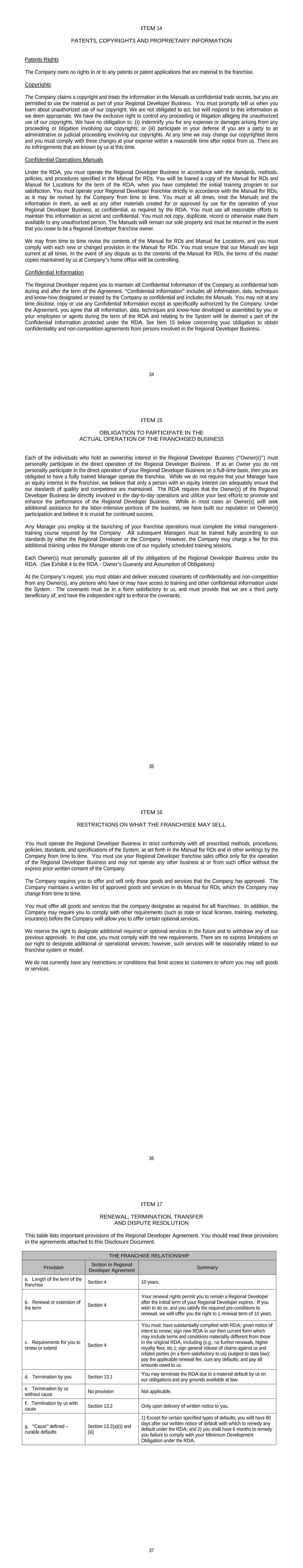 TABLE OF CONTENTS SECTION PAGE 1. GRANT OF RIGHTS………………………………………………………………………..…...1 2. REGIONAL DEVELOPER’S DEVELOPMENT OBLIGATION …………………................1 2.1 Minimum Development Obligations and Development Schedule ………...……….1 2.2 Regional Developer Sales Office and Opening …………………………..………..4 3. TERRITORIAL RIGHTS AND LIMITATIONS……………………………………..……..…………4 3.1 Territorial Rights…………………………..…………………...……....…………...4 3.2 Rights Maintained by Company………………………………...…………….........4 4. TERM AND RENEWAL…………………………………………......……..................…...….5 4.1 Initial Term and Renewal…………………………………………....……………...5 4.2 Conditions to Renew………………………………………………………………..5 5. ADDITIONAL OBLIGATIONS OF COMPANY AND REGIONAL DEVELOPER………...6 5.1 Regional Developer Training…………………………………………………….…6 5.2 Regional Developer Manual…………………………………………………...……6 5.3 General Guidance and Site Assistance/Review ……………………………….....…6 5.4 Franchise Registration and Disclosure……………………………………..……...7 5.5 Investigation and Qualification of Prospective Franchisees…………………..…..8 5.6 Training and Support…………………………………………………………....…9 5.7 Inspection of Franchises and Operations…………………………………..…...….10 5.8 Marketing and Promotion…………………………………………….…….……...10 5.9 Operation of Location Franchise ……………………………………………..……10 5.10 Report of Material Franchisee Violations……………….…………………………10 6. OPERATING STANDARDS…………………………………………………………………11 6.1 Standard of Service……………………………………………………………......11 6.2 Compliance with Laws and Good Business Practices………………………….....11 6.3 Accuracy of Information………………………………………………………......11 6.4 Notification of Litigation…………………………………………………....……..11 6.5 Insurance…………………………………………………………………………...12 6.6 Proof of Insurance Coverage……………………………………………….………12 6.7 Advertising Requirement and Cooperatives………………………………….…….12 6.8 Approval of Advertising…………………………………………………….……...13 6.9 Websites…………………………………………………………………………….13 6.10 Accounting, Bookkeeping and Records……………………………………………13 6.11 Reports and Annual Business Plan…………………………………………………13 6.12 Computer Systems………………………………………………………………….14 6.13 Management of Business…………………………………………………………...14 7. DEVELOPMENT FEE; SHARING OF COSTS IN THE DEVELOPMENT AREA ……………...….14 8. PAYMENTS TO REGIONAL DEVELOPER………………………………………………....14 8.1 Initial Fee Commission and Conditions of Payment…………………………….....14 8.2 Commissions on Royalty Fees………………………………………………….…..14 8.3 Commissions After Termination…………………………………………………...15 8.4 Application of Payments…………………………………………….…………….15 8.5 Setoffs and Refunds……………………………………………………….………15 9. MARKS…………………………………………………………………………………...…..15 9.1 Ownership and Goodwill of Marks……………………………………………….15 9.2 Limitations on Regional Developer’s Use of Marks……………………………..15 9.3 Notification of Infringements and Claims………………………………………...15 9.4 Discontinuance of Use of Marks………………………………………………….16 9.5 Indemnification For Use of Marks………………………………………………..16 10. CONFIDENTIAL INFORMATION………………………………………………………….16 11. ASSIGNABILITY…………………………………………………………………………….17 11.1 Assignability by Company………………………………………………………...17 11.2 Assignments by Regional Developer……………………………………………...17 11.3 Conditions for Approval of Assignment or Transfer……………………………...18 11.4 Assignment to Entity Principally Controlled By You………………………….….19 11.5 Death or Disability………………………………………………………………...20 11.6 Company’s Right of First Refusal…………………………………………………20 11.7 Ownership Structure……………………………………………………………….21 12. NON-COMPETITION…………………………………………………………………………21 12.1 In Term …………………………………..…………………………………………21 12.2 Post-Term……………………………...………………….………………………..22 13. TERMINATION………………………………………………………………………………22 13.1 Term