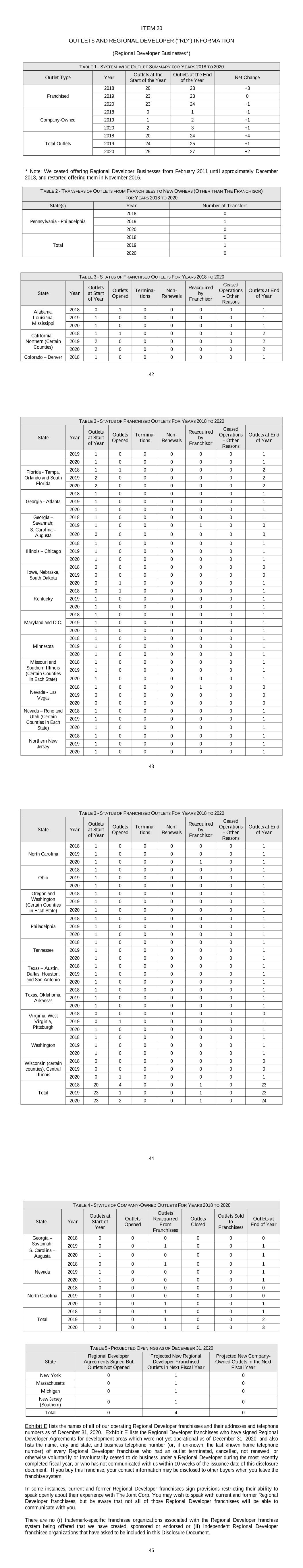 42 ITEM 20 OUTLETS AND REGIONAL DEVELOPER (“RD”) INFORMATION (Regional Developer Businesses*) TABLE 1 - SYSTEM-WIDE OUTLET SUMMARY FOR YEARS 2018 TO 2020 Outlet Type Year Outlets at the Start of the Year Outlets at the End of the Year Net Change Franchised 2018 20 23 +3 2019 23 23 0 2020 23 24 +1 Company-Owned 2018 0 1 +1 2019 1 2 +1 2020 2 3 +1 Total Outlets 2018 20 24 +4 2019 24 25 +1 2020 25 27 +2 * Note: We ceased offering Regional Developer Businesses from February 2011 until approximately December 2013, and restarted offering them in November 2016. TABLE 2 - TRANSFERS OF OUTLETS FROM FRANCHISEES TO NEW OWNERS (OTHER THAN THE FRANCHISOR) FOR YEARS 2018 TO 2020 State(s) Year Number of Transfers Pennsylvania - Philadelphia 2018 0 2019 1 2020 0 Total 2018 0 2019 1 2020 0 TABLE 3 - STATUS OF FRANCHISED OUTLETS FOR YEARS 2018 TO 2020 State Year Outlets at Start of Year Outlets Opened Termina- tions Non- Renewals Reacquired by Franchisor Ceased Operations – Other Reasons Outlets at End of Year Alabama, Louisiana, Mississippi 2018 0 1 0 0 0 0 1 2019 1 0 0 0 0 0 1 2020 1 0 0 0 0 0 1 California – Northern (Certain Counties) 2018 1 1 0 0 0 0 2 2019 2 0 0 0 0 0 2 2020 2 0 0 0 0 0 2 Colorado – Denver 2018 1 0 0 0 0 0 1 43 TABLE 3 - STATUS OF FRANCHISED OUTLETS FOR YEARS 2018 TO 2020 State Year Outlets at Start of Year Outlets Opened Termina- tions Non- Renewals Reacquired by Franchisor Ceased Operations – Other Reasons Outlets at End of Year 2019 1 0 0 0 0 0 1 2020 1 0 0 0 0 0 1 Florida - Tampa, Orlando and South Florida 2018 1 1 0 0 0 0 2 2019 2 0 0 0 0 0 2 2020 2 0 0 0 0 0 2 Georgia - Atlanta 2018 1 0 0 0 0 0 1 2019 1 0 0 0 0 0 1 2020 1 0 0 0 0 0 1 Georgia – Savannah; S. Carolina – Augusta 2018 1 0 0 0 0 0 1 2019 1 0 0 0 1 0 0 2020 0 0 0 0 0 0 0 Illinois – Chicago 2018 1 0 0 0 0 0 1 2019 1 0 0 0 0 0 1 2020 1 0 0 0 0 0 1 Iowa, Nebraska, South Dakota 2018 0 0 0 0 0 0 0 2019 0 0 0 0 0 0 0 2020 0 1 0 0 0 0 1 Kentucky 2018 0 1 0 0 0 0 1 2019 1 0 0 0 0 0 1 2020 1 0 0 0 0 0 1 Maryland and D.C. 2018 1 0 0 0 0 0 1 2019 1 0 0 0 0 0 1 2020 1 0 0 0 0 0 1 Minnesota 2018 1 0 0 0 0 0 1 2019 1 0 0 0 0 0 1 2020 1 0 0 0 0 0 1 Missouri and Southern Illinois (Certain Counties in Each State) 2018 1 0 0 0 0 0 1 2019 1 0 0 0 0 0 1 2020 1 0 0 0 0 0 1 Nevada - Las Vegas 2018 1 0 0 0 1 0 0 2019 0 0 0 0 0 0 0 2020 0 0 0 0 0 0 0 Nevada – Reno and Utah (Certain Counties in Each State) 2018 1 0 0 0 0 0 1 2019 1 0 0 0 0 0 1 2020 1 0 0 0 0 0 1 Northern New Jersey 2018 1 0 0 0 0 0 1 2019 1 0 0 0 0 0 1 2020 1 0 0 0 0 0 1 44 TABLE 3 - STATUS OF FRANCHISED OUTLETS FOR YEARS 2018 TO 2020 State Year Outlets at Start of Year Outlets Opened Termina- tions Non- Renewals Reacquired by Franchisor Ceased Operations – Other Reasons Outlets at End of Year North Carolina 2018 1 0 0 0 0 0 1 2019 1 0 0 0 0 0 1 2020 1 0 0 0 1 0 1 Ohio 2018 1 0 0 0 0 0 1 2019 1 0 0 0 0 0 1 2020 1 0 0 0 0 0 1 Oregon and Washington (Certain Counties in Each State) 2018 1 0 0 0 0 0 1 2019 1 0 0 0 0 0 1 2020 1 0 0 0 0 0 1 Philadelphia 2018 1 0 0 0 0 0 1 2019 1 0 0 0 0 0 1 2020 1 0 0 0 0 0 1 Tennessee 2018 1 0 0 0 0 0 1 2019 1 0 0 0 0 0 1 2020 1 0 0 0 0 0 1 Texas – Austin, Dallas, Houston, and San Antonio 2018 1 0 0 0 0 0 1 2019 1 0 0 0 0 0 1 2020 1 0 0 0 0 0 1 Texas, Oklahoma, Arkansas 2018 1 0 0 0 0 0 1 2019 1 0 0 0 0 0 1 2020 1 0 0 0 0 0 1 Virginia, West Virginia, Pittsburgh 2018 0 0 0 0 0 0 0 2019 0 1 0 0 0 0 1 2020 1 0 0 0 0 0 1 Washington 2018 1 0 0 0 0 0 1 2019 1 0 0 0 0 0 1 2020 1 0 0 0 0 0 1 Wisconsin (certain counties), Central Illinois 2018 0 0 0 0 0 0 0 2019 0 0 0 0 0 0 0 2020 0 1 0 0 0 0 1 Total 2018 20 4 0 0 1 0 23 2019 23 1 0 0 1 0 23 2020 23 2 0 0 1 0 24 45 TABLE 4 - STATUS OF COMPANY-OWNED OUTLETS FOR YEARS 2018 TO 2020 State Year Outlets at Start of Year Outlets Opened Outlets Reacquired From Franchisees Outlets Closed Outlets Sold to Franchisees Outlets at End of Year Georgia – Savannah; S. Carolina – Augusta 2018 0 0 0 0 0 0 2019 0 0 1 0 0 1 2020 1 0 0 0 0 1 Nevada 2018 0 0 1 0 0 1 2019 1 0 0 0 0 1 2020 1 0 0 0 0 1 North Carolina 2018 0 0 0 0 0 0 2019 0 0 0 0 0 0 2020 0 0 1 0 0 1 Total 2018 0 0 1 0 0 1 2019 1 0 1 0 0 2 2020 2 0 1 0 0 3 TABLE 5 - PROJECTED OPENINGS AS OF DECEMBER 31, 2020 State Regional Developer Agreements Signed But Outlets Not Opened Projected New Regional Developer Franchised Outlets in Next Fiscal Year Projected New Company- Owned Outlets in the Next Fiscal Year New York 0 1 0 Massachusetts 0 1 0 Michigan 0 1 0 New Jersey (Southern) 0 1 0 Total 0 4 0 Exhibit E lists the names of all of our operating Regional Developer franchisees and their addresses and telephone numbers as of December 31, 2020. Exhibit E lists the Regional Developer franchisees who have signed Regional Developer Agreements for development areas which were not yet operational as of December 31, 2020, and also lists the name, city and state, and business telephone number (or, if unknown, the last known home telephone number) of every Regional Developer franchisee who had an outlet terminated, cancelled, not renewed, or otherwise voluntarily or involuntarily ceased to do business under a Regional Developer during the most recently completed fiscal year, or who has not communicated with us within 10 weeks of the issuance date of this disclosure document. If you buy this franchise, your contact information may be disclosed to other buyers when you leave the franchise system. In some instances, current and former Regional Developer franchisees sign provisions restricting their ability to speak openly about their experience with The Joint Corp. You may wish to speak with current and former Regional Developer franchisees, but be aware that not all of those Regional Developer franchisees will be able to communicate with you. There are no (i) trademark-specific franchisee organizations associated with the Regional Developer franchise system being offered that we have created, sponsored or endorsed or (ii) independent Regional Developer fr