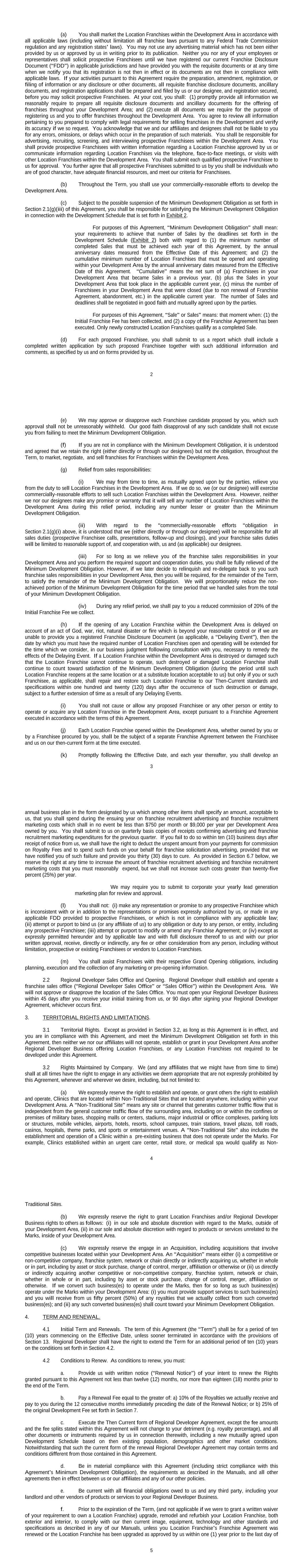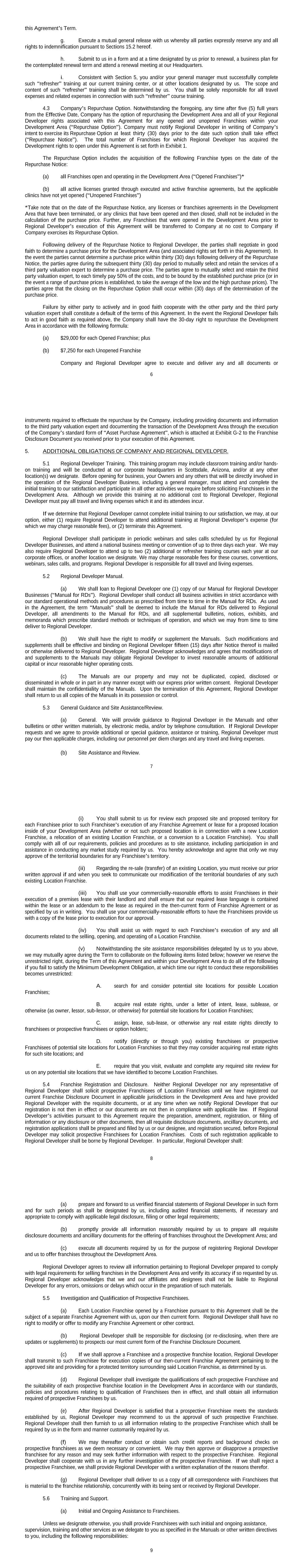 6 this Agreement’s Term. g. Execute a mutual general release with us whereby all parties expressly reserve any and all rights to indemnification pursuant to Sections 15.2 hereof. h. Submit to us in a form and at a time designated by us prior to renewal, a business plan for the contemplated renewal term and attend a renewal meeting at our Headquarters. i. Consistent with Section 5, you and/or your general manager must successfully complete such “refresher” training at our current training center, or at other locations designated by us. The scope and content of such “refresher” training shall be determined by us. You shall be solely responsible for all travel expenses and related expenses in connection with such “refresher” course training. 4.3 Company’s Repurchase Option. Notwithstanding the foregoing, any time after five (5) full years from the Effective Date, Company has the option of repurchasing the Development Area and all of your Regional Developer rights associated with this Agreement for any opened and unopened Franchises within your Development Area (“Repurchase Option”). Company must notify Regional Developer in writing of Company’s intent to exercise its Repurchase Option at least thirty (30) days prior to the date such option shall take effect (“Repurchase Notice”). The total number of Franchises for which Regional Developer has acquired the Development rights to open under this Agreement is set forth in Exhibit 1. The Repurchase Option includes the acquisition of the following Franchise types on the date of the Repurchase Notice: (a) all Franchises open and operating in the Development Area (“Opened Franchises”)* (b) all active licenses granted through executed and active franchise agreements, but the applicable clinics have not yet opened (“Unopened Franchises”) *Take note that on the date of the Repurchase Notice, any licenses or franchises agreements in the Development Area that have been terminated, or any clinics that have been opened and then closed, shall not be included in the calculation of the purchase price. Further, any Franchises that were opened in the Development Area prior to Regional Developer’s execution of this Agreement will be transferred to Company at no cost to Company if Company exercises its Repurchase Option. Following delivery of the Repurchase Notice to Regional Developer, the parties shall negotiate in good faith to determine a purchase price for the Development Area (and associated rights set forth in this Agreement). In the event the parties cannot determine a purchase price within thirty (30) days following delivery of the Repurchase Notice, the parties agree during the subsequent thirty (30) day period to mutually select and retain the services of a third party valuation expert to determine a purchase price. The parties agree to mutually select and retain the third party valuation expert, to each timely pay 50% of the costs, and to be bound by the established purchase price (or in the event a range of purchase prices is established, to take the average of the low and the high purchase prices). The parties agree that the closing on the Repurchase Option shall occur within (30) days of the determination of the purchase price. Failure by either party to actively and in good faith cooperate with the other party and the third party valuation expert shall constitute a default of the terms of this Agreement. In the event the Regional Developer fails to act in good faith as required above, the Company shall have the 30-day right to repurchase the Development Area in accordance with the following formula: (a) $29,000 for each Opened Franchise; plus (b) $7,250 for each Unopened Franchise Company and Regional Developer agree to execute and deliver any and all documents or 7 instruments required to effectuate the repurchase by the Company, including providing documents and information to the third party valuation expert and documenting the transaction of the Development Area through the execution of the Company’s standard form of “Asset Purchase Agreement”, which is attached at Exhibit G-2 to the Franchise Disclosure Document you received prior to your execution of this Agreement. 5. ADDITIONAL OBLIGATIONS OF COMPANY AND REGIONAL DEVELOPER. 5.1 Regional Developer Training. This training program may include classroom training and/or hands- on training and will be conducted at our corporate headquarters in Scottsdale, Arizona, and/or at any other location(s) we designate. Before opening for business, your Owners and any others that will be directly involved in the operation of the Regional Developer Business, including a general manager, must attend and complete the initial training to our satisfaction and participate in all other activities we require before soliciting Franchisees in the Development Area. Although we provide this training at no additional cost to Regional Developer, Regional Developer must pay all travel and living expenses which it and its attendees incur. If we determine that Regional Developer cannot complete initial training to our satisfaction, we may, at our option, either (1) require Regional Developer to attend additional training at Regional Developer’s expense (for which we may charge reasonable fees), or (2) terminate this Agreement. Regional Developer shall participate in periodic webinars and sales calls scheduled by us for Regional Developer Businesses, and attend a national business meeting or convention of up to three days each year. We may also require Regional Developer to attend up to two (2) additional or refresher training courses each year at our corporate offices, or another location we designate. We may charge reasonable fees for these courses, conventions, webinars, sales calls, and programs. Regional Developer is responsible for all travel and living expenses. 5.2 Regional Developer Manual. (a) We shall loan to Regional Developer one (1) copy of our Manual for Regional D