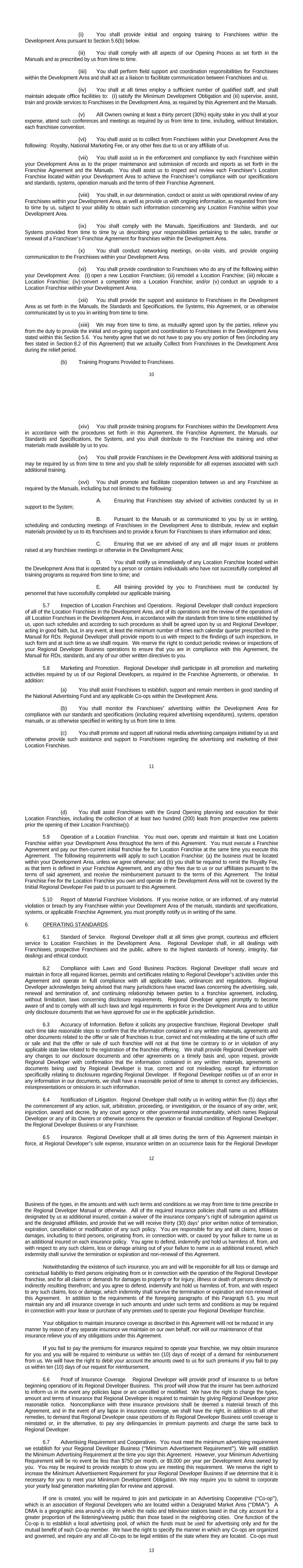 10 (i) You shall provide initial and ongoing training to Franchisees within the Development Area pursuant to Section 5.6(b) below. (ii) You shall comply with all aspects of our Opening Process as set forth in the Manuals and as prescribed by us from time to time. (iii) You shall perform field support and coordination responsibilities for Franchisees within the Development Area and shall act as a liaison to facilitate communication between Franchisees and us. (iv) You shall at all times employ a sufficient number of qualified staff, and shall maintain adequate office facilities to: (i) satisfy the Minimum Development Obligation and (ii) supervise, assist, train and provide services to Franchisees in the Development Area, as required by this Agreement and the Manuals. (v) All Owners owning at least a thirty percent (30%) equity stake in you shall at your expense, attend such conferences and meetings as required by us from time to time, including, without limitation, each franchisee convention. (vi) You shall assist us to collect from Franchisees within your Development Area the following: Royalty, National Marketing Fee, or any other fees due to us or any affiliate of us. (vii) You shall assist us in the enforcement and compliance by each Franchisee within your Development Area as to the proper maintenance and submission of records and reports as set forth in the Franchise Agreement and the Manuals. You shall assist us to inspect and review each Franchisee’s Location Franchise located within your Development Area to achieve the Franchisee’s compliance with our specifications and standards, systems, operation manuals and the terms of their Franchise Agreement. (viii) You shall, in our determination, conduct or assist us with operational review of any Franchisees within your Development Area, as well as provide us with ongoing information, as requested from time to time by us, subject to your ability to obtain such information concerning any Location Franchise within your Development Area. (ix) You shall comply with the Manuals, Specifications and Standards, and our Systems provided from time to time by us describing your responsibilities pertaining to the sales, transfer or renewal of a Franchisee’s Franchise Agreement for franchises within the Development Area. (x) You shall conduct networking meetings, on-site visits, and provide ongoing communication to the Franchisees within your Development Area. (xi) You shall provide coordination to Franchisees who do any of the following within your Development Area: (i) open a new Location Franchises; (ii) remodel a Location Franchise; (iii) relocate a Location Franchise; (iv) convert a competitor into a Location Franchise; and/or (v) conduct an upgrade to a Location Franchise within your Development Area. (xii) You shall provide the support and assistance to Franchisees in the Development Area as set forth in the Manuals, the Standards and Specifications, the Systems, this Agreement, or as otherwise communicated by us to you in writing from time to time. (xiii) We may from time to time, as mutually agreed upon by the parties, relieve you from the duty to provide the initial and on-going support and coordination to Franchisees in the Development Area stated within this Section 5.6. You hereby agree that we do not have to pay you any portion of fees (including any fees stated in Section 8.2 of this Agreement) that we actually Collect from Franchisees in the Development Area during the relief period. (b) Training Programs Provided to Franchisees. 11 (xiv) You shall provide training programs for Franchisees within the Development Area in accordance with the procedures set forth in this Agreement, the Franchise Agreement, the Manuals, our Standards and Specifications, the Systems, and you shall distribute to the Franchisee the training and other materials made available by us to you. (xv) You shall provide Franchisees in the Development Area with additional training as may be required by us from time to time and you shall be solely responsible for all expenses associated with such additional training. (xvi) You shall promote and facilitate cooperation between us and any Franchisee as required by the Manuals, including but not limited to the following: A. Ensuring that Franchisees stay advised of activities conducted by us in support to the System; B. Pursuant to the Manuals or as communicated to you by us in writing, scheduling and conducting meetings of Franchisees in the Development Area to distribute, review and explain materials provided by us to its franchisees and to provide a forum for Franchisees to share information and ideas; C. Ensuring that we are advised of any and all major issues or problems raised at any franchisee meetings or otherwise in the Development Area; D. You shall notify us immediately of any Location Franchise located within the Development Area that is operated by a person or contains individuals who have not successfully completed all training programs as required from time to time; and E. All training provided by you to Franchisees must be conducted by personnel that have successfully completed our applicable training. 5.7 Inspection of Location Franchises and Operations. Regional Developer shall conduct inspections of all of the Location Franchises in the Development Area, and of its operations and the review of the operations of all Location Franchises in the Development Area, in accordance with the standards from time to time established by us, upon such schedules and according to such procedures as shall be agreed upon by us and Regional Developer, acting in good faith, but, in any event, at least the minimum number of times each calendar quarter prescribed in the Manual for RDs. Regional Developer shall provide reports to us with respect to the findings of such inspections, in such form and at such time as we shall require. We reserve the right to conduct periodic reviews or inspections of your Regional Develope