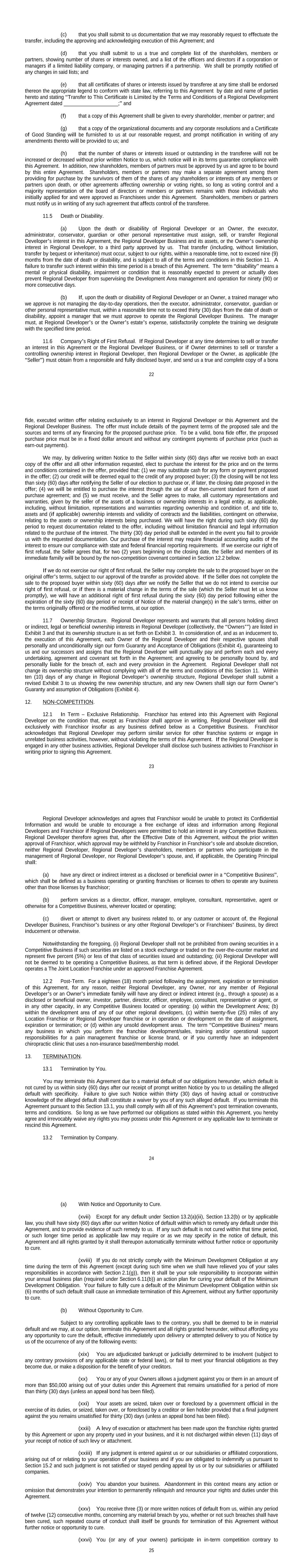 26 Section 12.1. (xxvii) You or any of your Owners, officers or directors is convicted of or pleads guilty or nolo contendere to a felony or any other crime or offense that is likely, in our reasonable business judgment, to adversely affect our reputation, the franchise system, the Marks or the goodwill associated therewith, or our interest therein. (xxviii) You purport, threaten, or take any action to make an assignment or transfer without our prior written consent or otherwise that will violate Section 11 of this Agreement. (xxix) You materially misuse or make any unauthorized use of the Marks or otherwise materially impair the goodwill associated therewith or our rights therein, or take any action that reflects materially and unfavorably upon the operation and reputation of the Company or the Company’s network generally. (xxx) Your unauthorized use, disclosure, or duplication of the Confidential Information, excluding independent acts of employees or others if you shall have exercised commercially-reasonable efforts to prevent such disclosures or use. (xxxi) You make any material misrepresentations in connection with the application for, execution of, or performance under this Agreement. 13.3 Rights and Obligations Upon Termination or Expiration. (a) Except to the extent that you have rights (if any) granted under a Franchise Agreement that has not terminated or expired, upon expiration or termination of this Agreement, you shall immediately take such action as we may require to accomplish the following: (xxxii) Cease to assist in the sale of The Joint® franchises, cease to use the system and Marks in any form, cease to hold yourself out as an Regional Developer of us and you shall not use or identify in any business name, any of the words “The Joint®”, “The Joint® Chiropractic”, or “The Joint…the chiropractic place®”; or any combination of such Marks or words, in any combination, form or fashion. (xxxiii) Pay all sums due to us, including but not limited to all obligations, trade accounts, promissory notes, financing agreements and equipment leases owing to us. (xxxiv) Submit such reports as we require, including but not limited to profit and loss statements for the two (2) year period preceding the date of termination or expiration. (xxxv) Return to us or to our designee the Manuals, Confidential Information, proprietary hardware, software, computer disks and all other trade secrets, trade dress, and other information and instructions delivered to you and all copies thereof. (xxxvi) Surrender to us such stationery, printed matter, signs and advertising materials containing the “The Joint®”, “The Joint® Chiropractic”, and/or “The Joint…the chiropractic place®” names and/or Marks. (xxxvii) Transfer, assign disconnect and forward the business telephone number, fax number, business Internet e-mail address and any other identifying information, listings or commercial holding out for your business to us or our designee. You shall not be required to transfer and assign to us any home or personal telephone number, fax number or e-mail address. (xxxviii) Transfer your “white” and “yellow” page telephone listings, references and advertisements and all trade and similar name registrations and business licenses and cancel any interest which you may have in the same. 27 (xxxix) Promptly take any action necessary to cancel any assumed name or equivalent registration that contains the mark “The Joint®”, “The Joint® Chiropractic”, and/or “The Joint…the chiropractic place®”; , or any other Mark, and submit to us proof of compliance with this obligation. (b) Upon termination or expiration of this Agreement, all monies earned or payable to us on account of Franchisees within the Development Area shall belong solely to us and you hereby forfeit any and all rights to the same upon the termination or expiration of the Agreement. Such monies shall not include unpaid obligations of us to you, which monies will be paid by us to you after we have first deducted any monies owed by you to us. (c) In the event of termination or expiration of this Agreement, you hereby authorize and appoint us or our designee to act as special agent or attorney-in-fact for you to transfer any listed telephone and fax numbers, transfer “white” pages and “yellow” pages listings, e-mail address, Internet presence and any other identifying information, listings or commercial holding out relating to your business and to enforce the conditional assignment of same to you or to our designee. (d) In the event of termination or expiration of this Agreement, you hereby authorize us to notify Franchisees, your customers, vendors, suppliers, landlord, banks, local advertisers and any other appropriate third-party that this Agreement has been terminated. (e) In the event of a termination or expiration of this Agreement, you hereby authorize and acknowledge that we will disclose your name, your address, your phone number, and other applicable information pursuant to any applicable law in all future Franchise Disclosure Documents. 13.4 Reserved. 13.5 General Provisions. Notwithstanding anything to the contrary contained in this Section 13, in the event any valid applicable law of a competent Governmental Authority having jurisdiction over this Agreement and the parties hereto shall limit our rights of termination hereunder or shall require longer notice or cure periods than those set forth above, this Agreement shall be deemed amended to conform to the minimum notice or cure periods or restrictions upon termination required by such laws and regulations. The parties shall not, however, be precluded from contesting the validity, enforceability or application of such laws or regulations in any action, hearing or dispute relating to this Agreement or the termination thereof. Our rights as stated in this Section 13 shall be without prejudice to any other rights or remedies provide