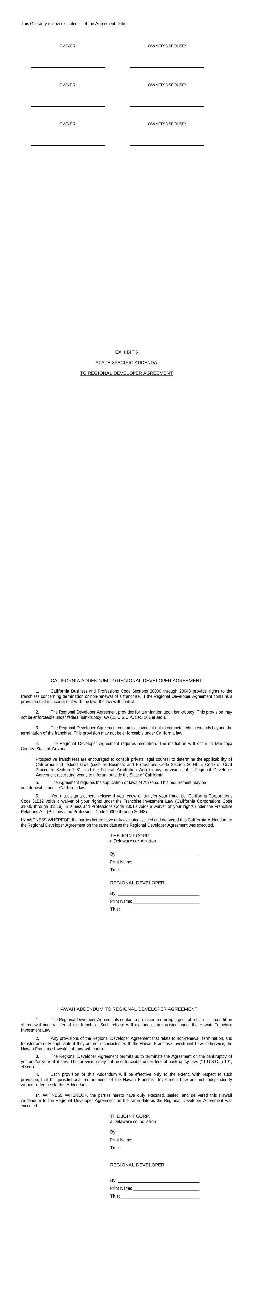 This Guaranty is now executed as of the Agreement Date. OWNER: OWNER’S SPOUSE: ____________________________________ ____________________________________ OWNER: OWNER’S SPOUSE: ____________________________________ ____________________________________ OWNER: OWNER’S SPOUSE: ____________________________________ ____________________________________ EXHIBIT 5 STATE-SPECIFIC ADDENDA TO REGIONAL DEVELOPER AGREEMENT CALIFORNIA ADDENDUM TO REGIONAL DEVELOPER AGREEMENT 1. California Business and Professions Code Sections 20000 through 20043 provide rights to the franchisee concerning termination or non-renewal of a franchise. If the Regional Developer Agreement contains a provision that is inconsistent with the law, the law will control. 2. The Regional Developer Agreement provides for termination upon bankruptcy. This provision may not be enforceable under federal bankruptcy law (11 U.S.C.A. Sec. 101 et seq.). 3. The Regional Developer Agreement contains a covenant not to compete, which extends beyond the termination of the franchise. This provision may not be enforceable under California law. 4. The Regional Developer Agreement requires mediation. The mediation will occur in Maricopa County, State of Arizona. Prospective franchisees are encouraged to consult private legal counsel to determine the applicability of California and federal laws (such as Business and Professions Code Section 20040.5, Code of Civil Procedure Section 1281, and the Federal Arbitration Act) to any provisions of a Regional Developer Agreement restricting venue to a forum outside the State of California. 5. The Agreement requires the application of laws of Arizona. This requirement may be unenforceable under California law. 6. You must sign a general release if you renew or transfer your franchise. California Corporations Code 31512 voids a waiver of your rights under the Franchise Investment Law (California Corporations Code 31000 through 31516). Business and Professions Code 20010 voids a waiver of your rights under the Franchise Relations Act (Business and Professions Code 20000 through 20043). IN WITNESS WHEREOF, the parties hereto have duly executed, sealed and delivered this California Addendum to the Regional Developer Agreement on the same date as the Regional Developer Agreement was executed. THE JOINT CORP. a Delaware corporation By: Print Name: Title: REGIONAL DEVELOPER By: Print Name: Title: HAWAII ADDENDUM TO REGIONAL DEVELOPER AGREEMENT 1. The Regional Developer Agreements contain a provision requiring a general release as a condition of renewal and transfer of the franchise. Such release will exclude claims arising under the Hawaii Franchise Investment Law. 2. Any provisions of the Regional Developer Agreement that relate to non-renewal, termination, and transfer are only applicable if they are not inconsistent with the Hawaii Franchise Investment Law. Otherwise, the Hawaii Franchise Investment Law will control. 3. The Regional Developer Agreement permits us to terminate the Agreement on the bankruptcy of you and/or your affiliates. This provision may not be enforceable under federal bankruptcy law. (11 U.S.C. § 101, et seq.). 4. Each provision of this Addendum will be effective only to the extent, with respect to such provision, that the jurisdictional requirements of the Hawaii Franchise Investment Law are met independently without reference to this Addendum. IN WITNESS WHEREOF, the parties hereto have duly executed, sealed, and delivered this Hawaii Addendum to the Regional Developer Agreement on the same date as the Regional Developer Agreement was executed. THE JOINT CORP. a Delaware corporation By: Print Name: Title: REGIONAL DEVELOPER By: Print Name: Title: