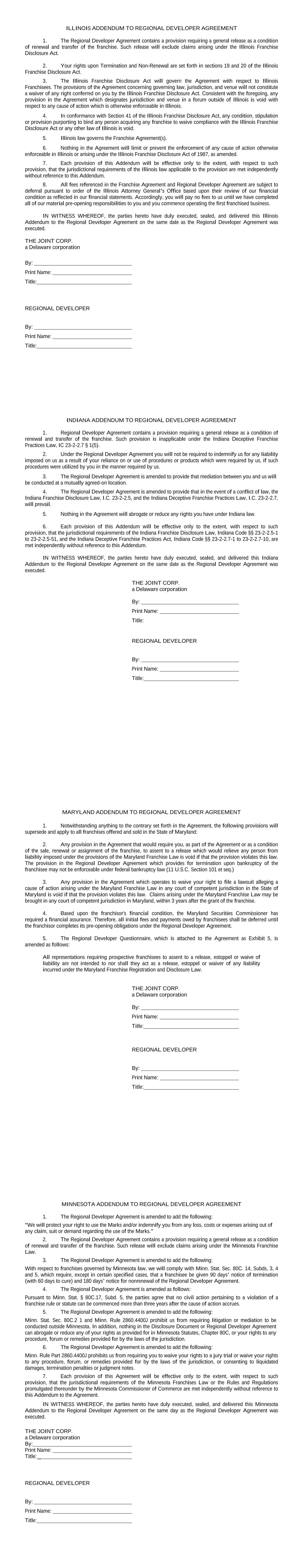 ILLINOIS ADDENDUM TO REGIONAL DEVELOPER AGREEMENT 1. The Regional Developer Agreement contains a provision requiring a general release as a condition of renewal and transfer of the franchise. Such release will exclude claims arising under the Illinois Franchise Disclosure Act. 2. Your rights upon Termination and Non-Renewal are set forth in sections 19 and 20 of the Illinois Franchise Disclosure Act. 3. The Illinois Franchise Disclosure Act will govern the Agreement with respect to Illinois Franchisees. The provisions of the Agreement concerning governing law, jurisdiction, and venue will not constitute a waiver of any right conferred on you by the Illinois Franchise Disclosure Act. Consistent with the foregoing, any provision in the Agreement which designates jurisdiction and venue in a forum outside of Illinois is void with respect to any cause of action which is otherwise enforceable in Illinois. 4. In conformance with Section 41 of the Illinois Franchise Disclosure Act, any condition, stipulation or provision purporting to bind any person acquiring any franchise to waive compliance with the Illinois Franchise Disclosure Act or any other law of Illinois is void. 5. Illinois law governs the Franchise Agreement(s). 6. Nothing in the Agreement will limit or prevent the enforcement of any cause of action otherwise enforceable in Illinois or arising under the Illinois Franchise Disclosure Act of 1987, as amended. 7. Each provision of this Addendum will be effective only to the extent, with respect to such provision, that the jurisdictional requirements of the Illinois law applicable to the provision are met independently without reference to this Addendum. 8. All fees referenced in the Franchise Agreement and Regional Developer Agreement are subject to deferral pursuant to order of the Illinois Attorney General’s Office based upon their review of our financial condition as reflected in our financial statements. Accordingly, you will pay no fees to us until we have completed all of our material pre-opening responsibilities to you and you commence operating the first franchised business. IN WITNESS WHEREOF, the parties hereto have duly executed, sealed, and delivered this Illinois Addendum to the Regional Developer Agreement on the same date as the Regional Developer Agreement was executed. THE JOINT CORP. a Delaware corporation By: Print Name: Title: REGIONAL DEVELOPER By: Print Name: Title: INDIANA ADDENDUM TO REGIONAL DEVELOPER AGREEMENT 1. Regional Developer Agreement contains a provision requiring a general release as a condition of renewal and transfer of the franchise. Such provision is inapplicable under the Indiana Deceptive Franchise Practices Law, IC 23-2-2.7 § 1(5). 2. Under the Regional Developer Agreement you will not be required to indemnify us for any liability imposed on us as a result of your reliance on or use of procedures or products which were required by us, if such procedures were utilized by you in the manner required by us. 3. The Regional Developer Agreement is amended to provide that mediation between you and us will be conducted at a mutually agreed-on location. 4. The Regional Developer Agreement is amended to provide that in the event of a conflict of law, the Indiana Franchise Disclosure Law, I.C. 23-2-2.5, and the Indiana Deceptive Franchise Practices Law, I.C. 23-2-2.7, will prevail. 5. Nothing in the Agreement will abrogate or reduce any rights you have under Indiana law. 6. Each provision of this Addendum will be effective only to the extent, with respect to such provision, that the jurisdictional requirements of the Indiana Franchise Disclosure Law, Indiana Code §§ 23-2-2.5-1 to 23-2-2.5-51, and the Indiana Deceptive Franchise Practices Act, Indiana Code §§ 23-2-2.7-1 to 23-2-2.7-10, are met independently without reference to this Addendum. IN WITNESS WHEREOF, the parties hereto have duly executed, sealed, and delivered this Indiana Addendum to the Regional Developer Agreement on the same date as the Regional Developer Agreement was executed. THE JOINT CORP. a Delaware corporation By: Print Name: Title: REGIONAL DEVELOPER By: Print Name: Title: MARYLAND ADDENDUM TO REGIONAL DEVELOPER AGREEMENT 1. Notwithstanding anything to the contrary set forth in the Agreement, the following provisions will supersede and apply to all franchises offered and sold in the State of Maryland: 2. Any provision in the Agreement that would require you, as part of the Agreement or as a condition of the sale, renewal or assignment of the franchise, to assent to a release which would relieve any person from liability imposed under the provisions of the Maryland Franchise Law is void if that the provision violates this law. The provision in the Regional Developer Agreement which provides for termination upon bankruptcy of the franchisee may not be enforceable under federal bankruptcy law (11 U.S.C. Section 101 et seq.) 3. Any provision in the Agreement which operates to waive your right to file a lawsuit alleging a cause of action arising under the Maryland Franchise Law in any court of competent jurisdiction in the State of Maryland is void if that the provision violates this law. Claims arising under the Maryland Franchise Law may be brought in any court of competent jurisdiction in Maryland, within 3 years after the grant of the franchise. 4. Based upon the franchisor's financial condition, the Maryland Securities Commissioner has required a financial assurance. Therefore, all initial fees and payments owed by franchisees shall be deferred until the franchisor completes its pre-opening obligations under the Regional Developer Agreement. 5. The Regional Developer Questionnaire, which is attached to the Agreement as Exhibit 5, is amended as follows: All representations requiring prospective franchisees to assent to a release, estoppel or waive of liability are not intended to nor shall they act as a release, estoppel or waiver of any liability incurred under the Maryland Fr