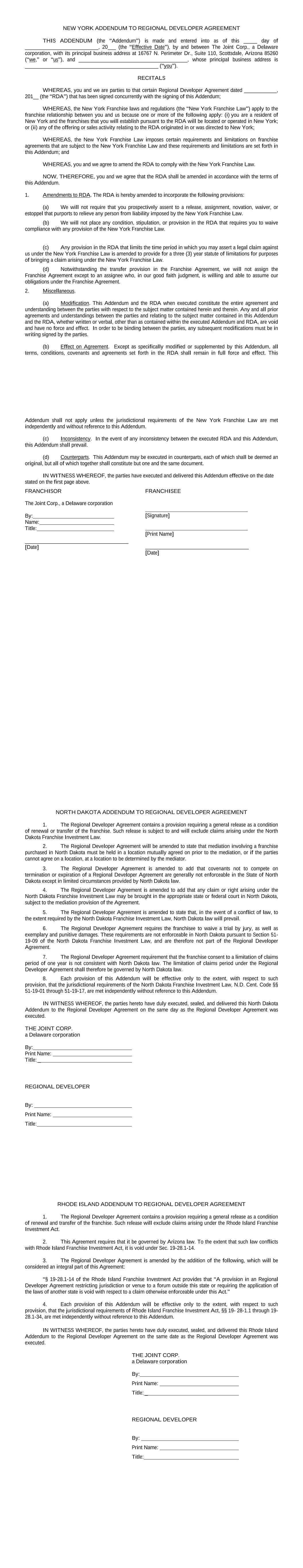 NEW YORK ADDENDUM TO REGIONAL DEVELOPER AGREEMENT THIS ADDENDUM (the “Addendum”) is made and entered into as of this _____ day of ___________________________, 20___ (the “Effective Date”), by and between The Joint Corp., a Delaware corporation, with its principal business address at 16767 N. Perimeter Dr., Suite 110, Scottsdale, Arizona 85260 (“we,” or “us”), and ________________________________________, whose principal business address is _________________________________________________ (“you”). RECITALS WHEREAS, you and we are parties to that certain Regional Developer Agreement dated ____________, 201__ (the “RDA”) that has been signed concurrently with the signing of this Addendum; WHEREAS, the New York Franchise laws and regulations (the “New York Franchise Law”) apply to the franchise relationship between you and us because one or more of the following apply: (i) you are a resident of New York and the franchises that you will establish pursuant to the RDA will be located or operated in New York; or (ii) any of the offering or sales activity relating to the RDA originated in or was directed to New York; WHEREAS, the New York Franchise Law imposes certain requirements and limitations on franchise agreements that are subject to the New York Franchise Law and these requirements and limitations are set forth in this Addendum; and WHEREAS, you and we agree to amend the RDA to comply with the New York Franchise Law. NOW, THEREFORE, you and we agree that the RDA shall be amended in accordance with the terms of this Addendum. 1. Amendments to RDA. The RDA is hereby amended to incorporate the following provisions: (a) We will not require that you prospectively assent to a release, assignment, novation, waiver, or estoppel that purports to relieve any person from liability imposed by the New York Franchise Law. (b) We will not place any condition, stipulation, or provision in the RDA that requires you to waive compliance with any provision of the New York Franchise Law. (c) Any provision in the RDA that limits the time period in which you may assert a legal claim against us under the New York Franchise Law is amended to provide for a three (3) year statute of limitations for purposes of bringing a claim arising under the New York Franchise Law. (d) Notwithstanding the transfer provision in the Franchise Agreement, we will not assign the Franchise Agreement except to an assignee who, in our good faith judgment, is willing and able to assume our obligations under the Franchise Agreement. 2. Miscellaneous. (a) Modification. This Addendum and the RDA when executed constitute the entire agreement and understanding between the parties with respect to the subject matter contained herein and therein. Any and all prior agreements and understandings between the parties and relating to the subject matter contained in this Addendum and the RDA, whether written or verbal, other than as contained within the executed Addendum and RDA, are void and have no force and effect. In order to be binding between the parties, any subsequent modifications must be in writing signed by the parties. (b) Effect on Agreement. Except as specifically modified or supplemented by this Addendum, all terms, conditions, covenants and agreements set forth in the RDA shall remain in full force and effect. This Addendum shall not apply unless the jurisdictional requirements of the New York Franchise Law are met independently and without reference to this Addendum. (c) Inconsistency. In the event of any inconsistency between the executed RDA and this Addendum, this Addendum shall prevail. (d) Counterparts. This Addendum may be executed in counterparts, each of which shall be deemed an original, but all of which together shall constitute but one and the same document. IN WITNESS WHEREOF, the parties have executed and delivered this Addendum effective on the date stated on the first page above. FRANCHISOR The Joint Corp., a Delaware corporation By: Name: Title: ______________________________________ [Date] FRANCHISEE [Signature] [Print Name] ______________________________________ [Date] NORTH DAKOTA ADDENDUM TO REGIONAL DEVELOPER AGREEMENT 1. The Regional Developer Agreement contains a provision requiring a general release as a condition of renewal or transfer of the franchise. Such release is subject to and will exclude claims arising under the North Dakota Franchise Investment Law. 2. The Regional Developer Agreement will be amended to state that mediation involving a franchise purchased in North Dakota must be held in a location mutually agreed on prior to the mediation, or if the parties cannot agree on a location, at a location to be determined by the mediator. 3. The Regional Developer Agreement is amended to add that covenants not to compete on termination or expiration of a Regional Developer Agreement are generally not enforceable in the State of North Dakota except in limited circumstances provided by North Dakota law. 4. The Regional Developer Agreement is amended to add that any claim or right arising under the North Dakota Franchise Investment Law may be brought in the appropriate state or federal court in North Dakota, subject to the mediation provision of the Agreement. 5. The Regional Developer Agreement is amended to state that, in the event of a conflict of law, to the extent required by the North Dakota Franchise Investment Law, North Dakota law will prevail. 6. The Regional Developer Agreement requires the franchisee to waive a trial by jury, as well as exemplary and punitive damages. These requirements are not enforceable in North Dakota pursuant to Section 51- 19-09 of the North Dakota Franchise Investment Law, and are therefore not part of the Regional Developer Agreement. 7. The Regional Developer Agreement requirement that the franchise consent to a limitation of claims period of one year is not consistent with North Dakota law. The limitation of claims period under the Regional Dev