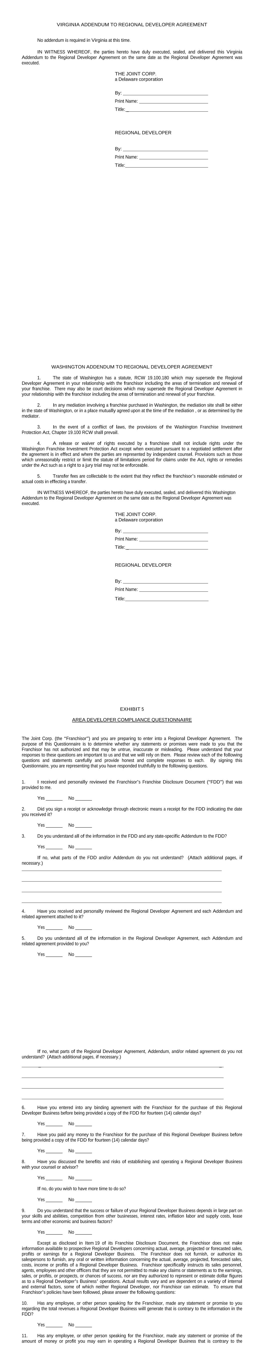 VIRGINIA ADDENDUM TO REGIONAL DEVELOPER AGREEMENT No addendum is required in Virginia at this time. IN WITNESS WHEREOF, the parties hereto have duly executed, sealed, and delivered this Virginia Addendum to the Regional Developer Agreement on the same date as the Regional Developer Agreement was executed. THE JOINT CORP. a Delaware corporation By: Print Name: Title: _ REGIONAL DEVELOPER By: Print Name: Title: WASHINGTON ADDENDUM TO REGIONAL DEVELOPER AGREEMENT 1. The state of Washington has a statute, RCW 19.100.180 which may supersede the Regional Developer Agreement in your relationship with the franchisor including the areas of termination and renewal of your franchise. There may also be court decisions which may supersede the Regional Developer Agreement in your relationship with the franchisor including the areas of termination and renewal of your franchise. 2. In any mediation involving a franchise purchased in Washington, the mediation site shall be either in the state of Washington, or in a place mutually agreed upon at the time of the mediation , or as determined by the mediator. 3. In the event of a conflict of laws, the provisions of the Washington Franchise Investment Protection Act, Chapter 19.100 RCW shall prevail. 4. A release or waiver of rights executed by a franchisee shall not include rights under the Washington Franchise Investment Protection Act except when executed pursuant to a negotiated settlement after the agreement is in effect and where the parties are represented by independent counsel. Provisions such as those which unreasonably restrict or limit the statute of limitations period for claims under the Act, rights or remedies under the Act such as a right to a jury trial may not be enforceable. 5. Transfer fees are collectable to the extent that they reflect the franchisor’s reasonable estimated or actual costs in effecting a transfer. IN WITNESS WHEREOF, the parties hereto have duly executed, sealed, and delivered this Washington Addendum to the Regional Developer Agreement on the same date as the Regional Developer Agreement was executed. THE JOINT CORP. a Delaware corporation By: Print Name: Title: _ REGIONAL DEVELOPER By: Print Name: Title: EXHIBIT 5 AREA DEVELOPER COMPLIANCE QUESTIONNAIRE The Joint Corp. (the “Franchisor”) and you are preparing to enter into a Regional Developer Agreement. The purpose of this Questionnaire is to determine whether any statements or promises were made to you that the Franchisor has not authorized and that may be untrue, inaccurate or misleading. Please understand that your responses to these questions are important to us and that we will rely on them. Please review each of the following questions and statements carefully and provide honest and complete responses to each. By signing this Questionnaire, you are representing that you have responded truthfully to the following questions. 1. I received and personally reviewed the Franchisor’s Franchise Disclosure Document (“FDD”) that was provided to me. Yes _______ No _______ 2. Did you sign a receipt or acknowledge through electronic means a receipt for the FDD indicating the date you received it? Yes _______ No _______ 3. Do you understand all of the information in the FDD and any state-specific Addendum to the FDD? Yes _______ No _______ If no, what parts of the FDD and/or Addendum do you not understand? (Attach additional pages, if necessary.) 4. Have you received and personally reviewed the Regional Developer Agreement and each Addendum and related agreement attached to it? Yes _______ No _______ 5. Do you understand all of the information in the Regional Developer Agreement, each Addendum and related agreement provided to you? Yes _______ No _______ If no, what parts of the Regional Developer Agreement, Addendum, and/or related agreement do you not understand? (Attach additional pages, if necessary.) _ _ 6. Have you entered into any binding agreement with the Franchisor for the purchase of this Regional Developer Business before being provided a copy of the FDD for fourteen (14) calendar days? Yes _______ No _______ 7. Have you paid any money to the Franchisor for the purchase of this Regional Developer Business before being provided a copy of the FDD for fourteen (14) calendar days? Yes _______ No _______ 8. Have you discussed the benefits and risks of establishing and operating a Regional Developer Business with your counsel or advisor? Yes _______ No _______ If no, do you wish to have more time to do so? Yes _______ No _______ 9. Do you understand that the success or failure of your Regional Developer Business depends in large part on your skills and abilities, competition from other businesses, interest rates, inflation labor and supply costs, lease terms and other economic and business factors? Yes _______ No _______ Except as disclosed in Item 19 of its Franchise Disclosure Document, the Franchisor does not make information available to prospective Regional Developers concerning actual, average, projected or forecasted sales, profits or earnings for a Regional Developer Business. The Franchisor does not furnish, or authorize its salespersons to furnish, any oral or written information concerning the actual, average, projected, forecasted sales, costs, income or profits of a Regional Developer Business. Franchisor specifically instructs its sales personnel, agents, employees and other officers that they are not permitted to make any claims or statements as to the earnings, sales, or profits, or prospects, or chances of success, nor are they authorized to represent or estimate dollar figures as to a Regional Developer’s Business’ operations. Actual results vary and are dependent on a variety of internal and external factors, some of which neither Regional Developer, nor Franchisor can estimate. To ensure that Franchisor’s policies have been followed, please answer the following questions: 10. Has any employee, or other person speaking for the Franchi