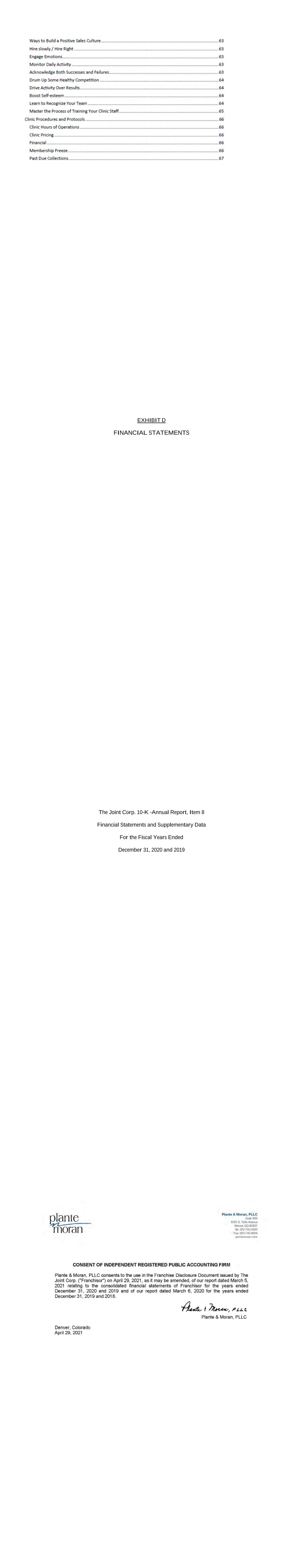 EXHIBIT D FINANCIAL STATEMENTS The Joint Corp. 10-K -Annual Report, Item 8 Financial Statements and Supplementary Data For the Fiscal Years Ended December 31, 2020 and 2019