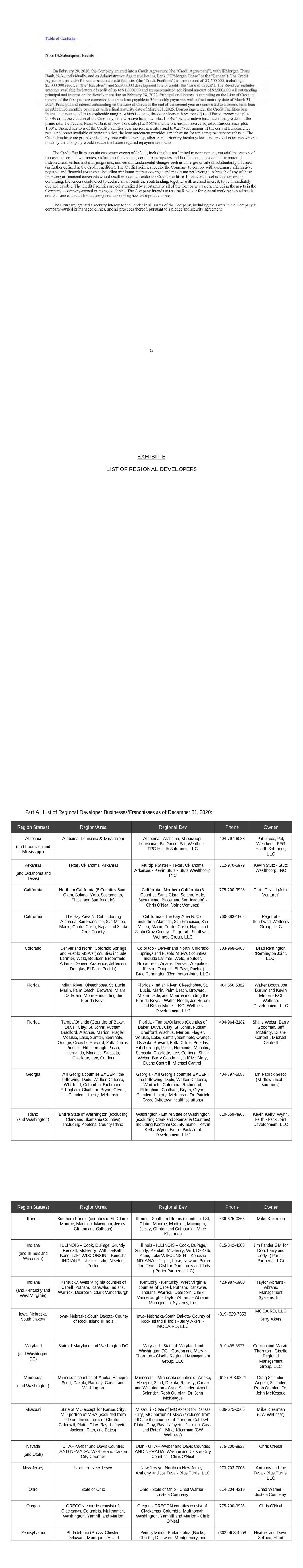 EXHIBIT E LIST OF REGIONAL DEVELOPERS Part A: List of Regional Developer Businesses/Franchisees as of December 31, 2020: Region State(s) Region/Area Regional Dev Phone Owner Alabama (and Louisiana and Mississippi) Alabama, Louisiana & Mississippi Alabama - Alabama, Mississippi, Louisiana - Pat Greco, Pat, Weathers - PPG Health Solutions, LLC 404-797-6088 Pat Greco, Pat, Weathers - PPG Health Solutions, LLC Arkansas (and Oklahoma and Texas) Texas, Oklahoma, Arkansas Multiple States - Texas, Oklahoma, Arkansas - Kevin Stutz - Stutz Wealthcorp, INC 512-970-5979 Kevin Stutz - Stutz Wealthcorp, INC California Northern California (6 Counties-Santa Clara, Solano, Yolo, Sacramento, Placer and San Joaquin) California - Northern California (6 Counties-Santa Clara, Solano, Yolo, Sacramento, Placer and San Joaquin) - Chris O'Neal (Joint Ventures) 775-200-9928 Chris O'Neal (Joint Ventures) California The Bay Area N. Cal including Alameda, San Francisco, San Mateo, Marin, Contra Costa, Napa and Santa Cruz County California - The Bay Area N. Cal including Alameda, San Francisco, San Mateo, Marin, Contra Costa, Napa and Santa Cruz County - Regi Lal - Southwest Wellness Group, LLC 760-383-1862 Regi Lal - Southwest Wellness Group, LLC Colorado Denver and North, Colorado Springs and Pueblo MSA's ( counties include Larimer, Weld, Boulder, Broomfield, Adams, Denver, Arapahoe, Jefferson, Douglas, El Paso, Pueblo) Colorado - Denver and North, Colorado Springs and Pueblo MSA's ( counties include Larimer, Weld, Boulder, Broomfield, Adams, Denver, Arapahoe, Jefferson, Douglas, El Paso, Pueblo) - Brad Remington (Remington Joint, LLC) 303-968-5408 Brad Remington (Remington Joint, LLC) Florida Indian River, Okeechobee, St. Lucie, Marin, Palm Beach, Broward, Miami Dade, and Monroe including the Florida Keys. Florida - Indian River, Okeechobee, St. Lucie, Marin, Palm Beach, Broward, Miami Dade, and Monroe including the Florida Keys. - Walter Booth, Joe Burum and Kevin Minter - KCI Wellness Development, LLC 404.556.5882 Walter Booth, Joe Burum and Kevin Minter - KCI Wellness Development, LLC Florida Tampa/Orlando (Counties of Baker, Duval, Clay, St. Johns, Putnam, Bradford, Alachua, Marion, Flagler, Volusia, Lake, Sumter, Seminole, Orange, Osceola, Brevard, Polk, Citrus, Pinellas, Hillsborough, Pasco, Hernando, Manatee, Sarasota, Charlotte, Lee, Collier) Florida - Tampa/Orlando (Counties of Baker, Duval, Clay, St. Johns, Putnam, Bradford, Alachua, Marion, Flagler, Volusia, Lake, Sumter, Seminole, Orange, Osceola, Brevard, Polk, Citrus, Pinellas, Hillsborough, Pasco, Hernando, Manatee, Sarasota, Charlotte, Lee, Collier) - Shane Weber, Barry Goodman, Jeff McGinty, Duane Cantrell, Michael Cantrell 404-964-3182 Shane Weber, Barry Goodman, Jeff McGinty, Duane Cantrell, Michael Cantrell Georgia All Georgia counties EXCEPT the following: Dade, Walker, Catoosa, Whitfield, Columbia, Richmond, Effingham, Chatham, Bryan, Glynn, Camden, Liberty, McIntosh Georgia - All Georgia counties EXCEPT the following: Dade, Walker, Catoosa, Whitfield, Columbia, Richmond, Effingham, Chatham, Bryan, Glynn, Camden, Liberty, McIntosh - Dr. Patrick Greco (Midtown health solutions) 404-797-6088 Dr. Patrick Greco (Midtown health soultions) Idaho (and Washington) Entire State of Washington (excluding Clark and Skamania Counties) Including Kootenai County Idaho Washington - Entire State of Washington (excluding Clark and Skamania Counties) Including Kootenai County Idaho - Kevin Kelly, Wynn, Faith - Pack Joint Development, LLC 610-659-4968 Kevin Kelly, Wynn, Faith - Pack Joint Development, LLC Region State(s) Region/Area Regional Dev Phone Owner Illinois Southern Illinois (counties of St. Claire, Monroe, Madison, Macoupin, Jersey, Clinton and Calhoun) Illinois - Southern Illinois (counties of St. Claire, Monroe, Madison, Macoupin, Jersey, Clinton and Calhoun) - Mike Klearman 636-675-0366 Mike Klearman Indiana (and Illinois and Wisconsin) ILLINOIS – Cook, DuPage, Grundy, Kendall, McHenry, Will, DeKalb, Kane, Lake WISCONSIN – Kenosha INDIANA – Jasper, Lake, Newton, Porter Illinois - ILLINOIS – Cook, DuPage, Grundy, Kendall, McHenry, Will, DeKalb, Kane, Lake WISCONSIN – Kenosha INDIANA – Jasper, Lake, Newton, Porter - Jim Fender GM for Don, Larry and Jody -( Porter Partners, LLC) 815-342-4203 Jim Fender GM for Don, Larry and Jody -( Porter Partners, LLC) Indiana (and Kentucky and West Virginia) Kentucky, West Virginia counties of Cabell, Putnam, Kanawha. Indiana, Warrick, Dearborn, Clark Vanderburgh Kentucky - Kentucky, West Virginia counties of Cabell, Putnam, Kanawha. Indiana, Warrick, Dearborn, Clark Vanderburgh - Taylor Abrams - Abrams Management Systems, Inc. 423-987-6980 Taylor Abrams - Abrams Management Systems, Inc. Iowa, Nebraska, South Dakota Iowa- Nebraska-South Dakota- County of Rock Island Illinois Iowa- Nebraska-South Dakota- County of Rock Island Illinois - Jerry Akers - MOCA RD, LLC (319) 929-7853 MOCA RD, LLC Jerry Akers Maryland (and Washington DC) State of Maryland and Washington DC Maryland - State of Maryland and Washington DC - Gordon and Marvin Thornton - Giselle Regional Management Group, LLC 910.495.6877 Gordon and Marvin Thornton - Giselle Regional Management Group, LLC Minnesota (and Washington) Minnesota counties of Anoka, Henepin, Scott, Dakota, Ramsey, Carver and Washington Minnesota - Minnesota counties of Anoka, Henepin, Scott, Dakota, Ramsey, Carver and Washington - Craig Selander, Angela, Selander, Robb Quinlan, Dr. John McKeague (612) 703.0224 Craig Selander, Angela, Selander, Robb Quinlan, Dr. John McKeague Missouri State of MO except for Kansas City, MO portion of MSA (excluded from RD are the counties of Cliniton, Caldewll, Platte, Clay, Ray, Lafayette, Jackson, Cass, and Bates) Missouri - State of MO except for Kansas City, MO portion of MSA (excluded from RD are the counties of Cliniton, Caldewll, Platte, Clay, Ray, Lafayette, Jackson, Cass, and Bates) - Mike Klearman (CW Wellness) 636-675-0366 Mike Kle