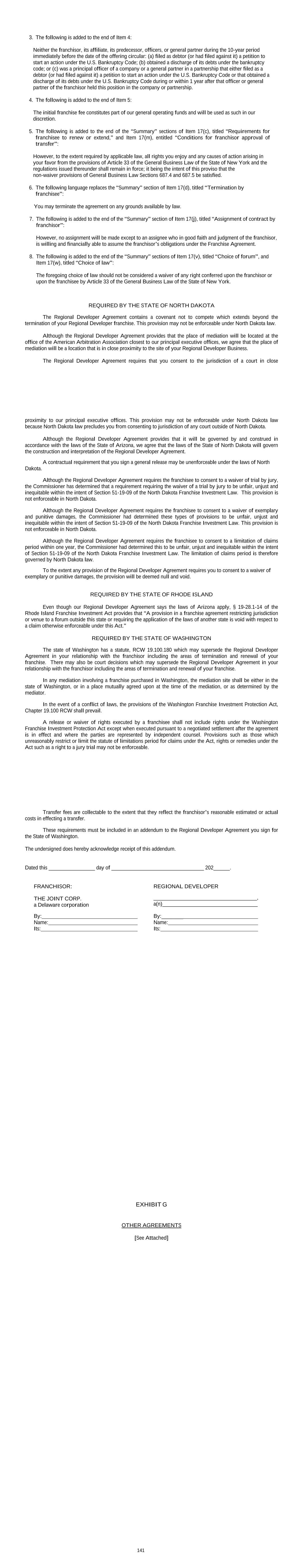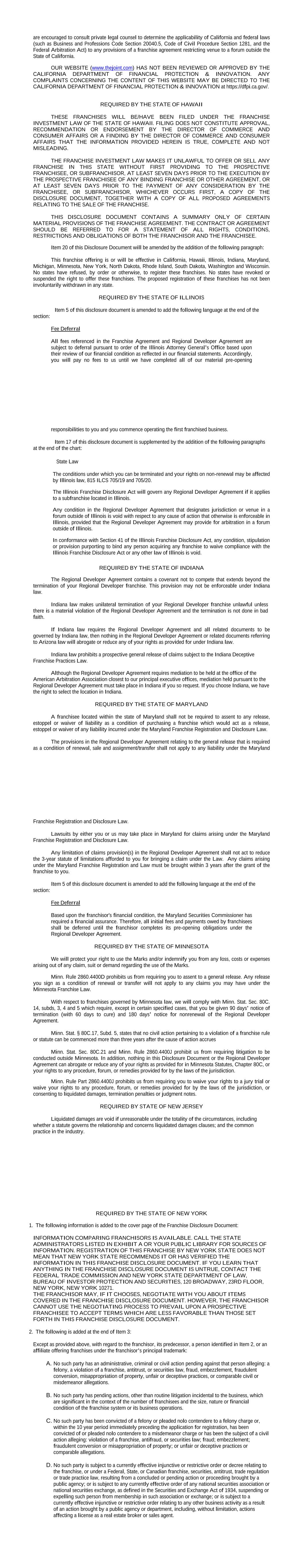 are encouraged to consult private legal counsel to determine the applicability of California and federal laws (such as Business and Professions Code Section 20040.5, Code of Civil Procedure Section 1281, and the Federal Arbitration Act) to any provisions of a franchise agreement restricting venue to a forum outside the State of California. OUR WEBSITE (www.thejoint.com) HAS NOT BEEN REVIEWED OR APPROVED BY THE CALIFORNIA DEPARTMENT OF FINANCIAL PROTECTION & INNOVATION. ANY COMPLAINTS CONCERNING THE CONTENT OF THIS WEBSITE MAY BE DIRECTED TO THE CALIFORNIA DEPARTMENT OF FINANCIAL PROTECTION & INNOVATION at https://dfpi.ca.gov/. REQUIRED BY THE STATE OF HAWAII THESE FRANCHISES WILL BE/HAVE BEEN FILED UNDER THE FRANCHISE INVESTMENT LAW OF THE STATE OF HAWAII. FILING DOES NOT CONSTITUTE APPROVAL, RECOMMENDATION OR ENDORSEMENT BY THE DIRECTOR OF COMMERCE AND CONSUMER AFFAIRS OR A FINDING BY THE DIRECTOR OF COMMERCE AND CONSUMER AFFAIRS THAT THE INFORMATION PROVIDED HEREIN IS TRUE, COMPLETE AND NOT MISLEADING. THE FRANCHISE INVESTMENT LAW MAKES IT UNLAWFUL TO OFFER OR SELL ANY FRANCHISE IN THIS STATE WITHOUT FIRST PROVIDING TO THE PROSPECTIVE FRANCHISEE, OR SUBFRANCHISOR, AT LEAST SEVEN DAYS PRIOR TO THE EXECUTION BY THE PROSPECTIVE FRANCHISEE OF ANY BINDING FRANCHISE OR OTHER AGREEMENT, OR AT LEAST SEVEN DAYS PRIOR TO THE PAYMENT OF ANY CONSIDERATION BY THE FRANCHISEE, OR SUBFRANCHISOR, WHICHEVER OCCURS FIRST, A COPY OF THE DISCLOSURE DOCUMENT, TOGETHER WITH A COPY OF ALL PROPOSED AGREEMENTS RELATING TO THE SALE OF THE FRANCHISE. THIS DISCLOSURE DOCUMENT CONTAINS A SUMMARY ONLY OF CERTAIN MATERIAL PROVISIONS OF THE FRANCHISE AGREEMENT. THE CONTRACT OR AGREEMENT SHOULD BE REFERRED TO FOR A STATEMENT OF ALL RIGHTS, CONDITIONS, RESTRICTIONS AND OBLIGATIONS OF BOTH THE FRANCHISOR AND THE FRANCHISEE. Item 20 of this Disclosure Document will be amended by the addition of the following paragraph: This franchise offering is or will be effective in California, Hawaii, Illinois, Indiana, Maryland, Michigan, Minnesota, New York, North Dakota, Rhode Island, South Dakota, Washington and Wisconsin. No states have refused, by order or otherwise, to register these franchises. No states have revoked or suspended the right to offer these franchises. The proposed registration of these franchises has not been involuntarily withdrawn in any state. REQUIRED BY THE STATE OF ILLINOIS Item 5 of this disclosure document is amended to add the following language at the end of the section: Fee Deferral All fees referenced in the Franchise Agreement and Regional Developer Agreement are subject to deferral pursuant to order of the Illinois Attorney General’s Office based upon their review of our financial condition as reflected in our financial statements. Accordingly, you will pay no fees to us until we have completed all of our material pre-opening responsibilities to you and you commence operating the first franchised business. Item 17 of this disclosure document is supplemented by the addition of the following paragraphs at the end of the chart: State Law The conditions under which you can be terminated and your rights on non-renewal may be affected by Illinois law, 815 ILCS 705/19 and 705/20. The Illinois Franchise Disclosure Act will govern any Regional Developer Agreement if it applies to a subfranchise located in Illinois. Any condition in the Regional Developer Agreement that designates jurisdiction or venue in a forum outside of Illinois is void with respect to any cause of action that otherwise is enforceable in Illinois, provided that the Regional Developer Agreement may provide for arbitration in a forum outside of Illinois. In conformance with Section 41 of the Illinois Franchise Disclosure Act, any condition, stipulation or provision purporting to bind any person acquiring any franchise to waive compliance with the Illinois Franchise Disclosure Act or any other law of Illinois is void. REQUIRED BY THE STATE OF INDIANA The Regional Developer Agreement contains a covenant not to compete that extends beyond the termination of your Regional Developer franchise. This provision may not be enforceable under Indiana law. Indiana law makes unilateral termination of your Regional Developer franchise unlawful unless there is a material violation of the Regional Developer Agreement and the termination is not done in bad faith. If Indiana law requires the Regional Developer Agreement and all related documents to be governed by Indiana law, then nothing in the Regional Developer Agreement or related documents referring to Arizona law will abrogate or reduce any of your rights as provided for under Indiana law. Indiana law prohibits a prospective general release of claims subject to the Indiana Deceptive Franchise Practices Law. Although the Regional Developer Agreement requires mediation to be held at the office of the American Arbitration Association closest to our principal executive offices, mediation held pursuant to the Regional Developer Agreement must take place in Indiana if you so request. If you choose Indiana, we have the right to select the location in Indiana. REQUIRED BY THE STATE OF MARYLAND A franchisee located within the state of Maryland shall not be required to assent to any release, estoppel or waiver of liability as a condition of purchasing a franchise which would act as a release, estoppel or waiver of any liability incurred under the Maryland Franchise Registration and Disclosure Law. The provisions in the Regional Developer Agreement relating to the general release that is required as a condition of renewal, sale and assignment/transfer shall not apply to any liability under the Maryland Franchise Registration and Disclosure Law. Lawsuits by either you or us may take place in Maryland for claims arising under the Maryland Franchise Registration and Disclosure Law. Any limitation of claims provision(s) in the Regional Developer Agreement shall not act to reduce the 3-year statute of limitations a