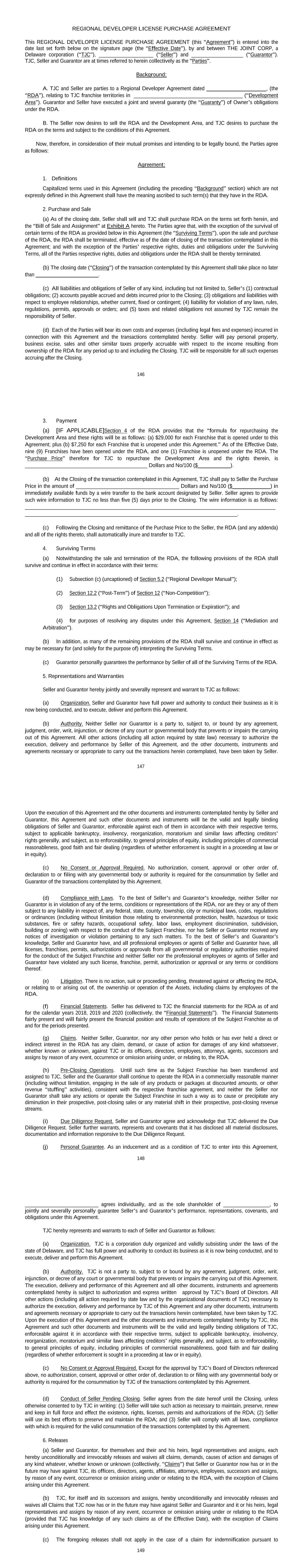146 REGIONAL DEVELOPER LICENSE PURCHASE AGREEMENT This REGIONAL DEVELOPER LICENSE PURCHASE AGREEMENT (this “Agreement”) is entered into the date last set forth below on the signature page (the “Effective Date”), by and between THE JOINT CORP, a Delaware corporation (“TJC”), ____________________ (“Seller”) and ___________________ (“Guarantor”). TJC, Seller and Guarantor are at times referred to herein collectively as the “Parties”. Background: A. TJC and Seller are parties to a Regional Developer Agreement dated ______________________, (the “RDA”), relating to TJC franchise territories in ________________________________________ (“Development Area”). Guarantor and Seller have executed a joint and several guaranty (the “Guaranty”) of Owner’s obligations under the RDA. B. The Seller now desires to sell the RDA and the Development Area, and TJC desires to purchase the RDA on the terms and subject to the conditions of this Agreement. Now, therefore, in consideration of their mutual promises and intending to be legally bound, the Parties agree as follows: Agreement: 1. Definitions Capitalized terms used in this Agreement (including the preceding “Background” section) which are not expressly defined in this Agreement shall have the meaning ascribed to such term(s) that they have in the RDA. 2. Purchase and Sale (a) As of the closing date, Seller shall sell and TJC shall purchase RDA on the terms set forth herein, and the “Bill of Sale and Assignment” at Exhibit A hereto. The Parties agree that, with the exception of the survival of certain terms of the RDA as provided below in this Agreement (the “Surviving Terms”), upon the sale and purchase of the RDA, the RDA shall be terminated, effective as of the date of closing of the transaction contemplated in this Agreement; and with the exception of the Parties’ respective rights, duties and obligations under the Surviving Terms, all of the Parties respective rights, duties and obligations under the RDA shall be thereby terminated. (b) The closing date (“Closing”) of the transaction contemplated by this Agreement shall take place no later than _______________________. (c) All liabilities and obligations of Seller of any kind, including but not limited to, Seller’s (1) contractual obligations; (2) accounts payable accrued and debts incurred prior to the Closing; (3) obligations and liabilities with respect to employee relationships, whether current, fixed or contingent; (4) liability for violation of any laws, rules, regulations, permits, approvals or orders; and (5) taxes and related obligations not assumed by TJC remain the responsibility of Seller. (d) Each of the Parties will bear its own costs and expenses (including legal fees and expenses) incurred in connection with this Agreement and the transactions contemplated hereby. Seller will pay personal property, business excise, sales and other similar taxes properly accruable with respect to the income resulting from ownership of the RDA for any period up to and including the Closing. TJC will be responsible for all such expenses accruing after the Closing. 147 3. Payment (a) [IF APPLICABLE]Section 4 of the RDA provides that the “formula for repurchasing the Development Area and these rights will be as follows: (a) $29,000 for each Franchise that is opened under to this Agreement; plus (b) $7,250 for each Franchise that is unopened under this Agreement.” As of the Effective Date, nine (9) Franchises have been opened under the RDA, and one (1) Franchise is unopened under the RDA. The “Purchase Price” therefore for TJC to repurchase the Development Area and the rights therein, is _____________________________________________ Dollars and No/100 ($____________). (b) At the Closing of the transaction contemplated in this Agreement, TJC shall pay to Seller the Purchase Price in the amount of ______________________________________ Dollars and No/100 ($______________) in immediately available funds by a wire transfer to the bank account designated by Seller. Seller agrees to provide such wire information to TJC no less than five (5) days prior to the Closing. The wire information is as follows: ____________________________________________________________________________________________ ______________________________________________________________________________. (c) Following the Closing and remittance of the Purchase Price to the Seller, the RDA (and any addenda) and all of the rights thereto, shall automatically inure and transfer to TJC. 4. Surviving Terms (a) Notwithstanding the sale and termination of the RDA, the following provisions of the RDA shall survive and continue in effect in accordance with their terms: (1) Subsection (c) (uncaptioned) of Section 5.2 (“Regional Developer Manual”); (2) Section 12.2 (“Post-Term”) of Section 12 (“Non-Competition”); (3) Section 13.2 (“Rights and Obligations Upon Termination or Expiration”); and (4) for purposes of resolving any disputes under this Agreement, Section 14 (“Mediation and Arbitration”). (b) In addition, as many of the remaining provisions of the RDA shall survive and continue in effect as may be necessary for (and solely for the purpose of) interpreting the Surviving Terms. (c) Guarantor personally guarantees the performance by Seller of all of the Surviving Terms of the RDA. 5. Representations and Warranties Seller and Guarantor hereby jointly and severally represent and warrant to TJC as follows: (a) Organization. Seller and Guarantor have full power and authority to conduct their business as it is now being conducted, and to execute, deliver and perform this Agreement. (b) Authority. Neither Seller nor Guarantor is a party to, subject to, or bound by any agreement, judgment, order, writ, injunction, or decree of any court or governmental body that prevents or impairs the carrying out of this Agreement. All other actions (including all action required by state 