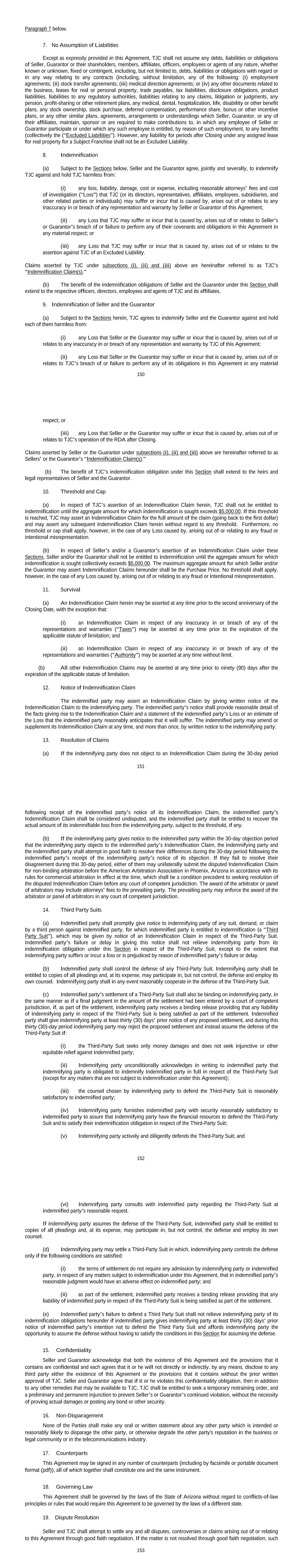 150 Paragraph 7 below. 7. No Assumption of Liabilities Except as expressly provided in this Agreement, TJC shall not assume any debts, liabilities or obligations of Seller, Guarantor or their shareholders, members, affiliates, officers, employees or agents of any nature, whether known or unknown, fixed or contingent, including, but not limited to, debts, liabilities or obligations with regard or in any way relating to any contracts (including, without limitation, any of the following: (i) employment agreements; (ii) stock transfer agreements; (iii) medical direction agreements; or (iv) any other documents related to the business, leases for real or personal property, trade payables, tax liabilities, disclosure obligations, product liabilities, liabilities to any regulatory authorities, liabilities relating to any claims, litigation or judgments, any pension, profit-sharing or other retirement plans, any medical, dental, hospitalization, life, disability or other benefit plans, any stock ownership, stock purchase, deferred compensation, performance share, bonus or other incentive plans, or any other similar plans, agreements, arrangements or understandings which Seller, Guarantor, or any of their affiliates, maintain, sponsor or are required to make contributions to, in which any employee of Seller or Guarantor participate or under which any such employee is entitled, by reason of such employment, to any benefits (collectively the (“Excluded Liabilities”). However, any liability for periods after Closing under any assigned lease for real property for a Subject Franchise shall not be an Excluded Liability. 8. Indemnification (a) Subject to the Sections below, Seller and the Guarantor agree, jointly and severally, to indemnify TJC against and hold TJC harmless from: (i) any loss, liability, damage, cost or expense, including reasonable attorneys’ fees and cost of investigation (“Loss”) that TJC (or its directors, representatives, affiliates, employees, subsidiaries, and other related parties or individuals) may suffer or incur that is caused by, arises out of or relates to any inaccuracy in or breach of any representation and warranty by Seller or Guarantor of this Agreement; (ii) any Loss that TJC may suffer or incur that is caused by, arises out of or relates to Seller’s or Guarantor’s breach of or failure to perform any of their covenants and obligations in this Agreement in any material respect; or (iii) any Loss that TJC may suffer or incur that is caused by, arises out of or relates to the assertion against TJC of an Excluded Liability. Claims asserted by TJC under subsections (i), (ii) and (iii) above are hereinafter referred to as TJC’s “Indemnification Claim(s).” (b) The benefit of the indemnification obligations of Seller and the Guarantor under this Section shall extend to the respective officers, directors, employees and agents of TJC and its affiliates. 9. Indemnification of Seller and the Guarantor (a) Subject to the Sections herein, TJC agrees to indemnify Seller and the Guarantor against and hold each of them harmless from: (i) any Loss that Seller or the Guarantor may suffer or incur that is caused by, arises out of or relates to any inaccuracy in or breach of any representation and warranty by TJC of this Agreement; (ii) any Loss that Seller or the Guarantor may suffer or incur that is caused by, arises out of or relates to TJC’s breach of or failure to perform any of its obligations in this Agreement in any material 151 respect; or (iii) any Loss that Seller or the Guarantor may suffer or incur that is caused by, arises out of or relates to TJC’s operation of the RDA after Closing. Claims asserted by Seller or the Guarantor under subsections (i), (ii) and (iii) above are hereinafter referred to as Sellers’ or the Guarantor’s “Indemnification Claim(s).” (b) The benefit of TJC’s indemnification obligation under this Section shall extend to the heirs and legal representatives of Seller and the Guarantor. 10. Threshold and Cap (a) In respect of TJC’s assertion of an Indemnification Claim herein, TJC shall not be entitled to indemnification until the aggregate amount for which indemnification is sought exceeds $5,000.00. If this threshold is reached, TJC may assert an Indemnification Claim for the full amount of the claim (going back to the first dollar) and may assert any subsequent Indemnification Claim herein without regard to any threshold. Furthermore, no threshold or cap shall apply, however, in the case of any Loss caused by, arising out of or relating to any fraud or intentional misrepresentation. (b) In respect of Seller’s and/or a Guarantor’s assertion of an Indemnification Claim under these Sections, Seller and/or the Guarantor shall not be entitled to indemnification until the aggregate amount for which indemnification is sought collectively exceeds $5,000.00. The maximum aggregate amount for which Seller and/or the Guarantor may assert Indemnification Claims hereunder shall be the Purchase Price. No threshold shall apply, however, in the case of any Loss caused by, arising out of or relating to any fraud or intentional misrepresentation. 11. Survival (a) An Indemnification Claim herein may be asserted at any time prior to the second anniversary of the Closing Date, with the exception that: (i) an Indemnification Claim in respect of any inaccuracy in or breach of any of the representations and warranties (“Taxes”) may be asserted at any time prior to the expiration of the applicable statute of limitation; and (ii) an Indemnification Claim in respect of any inaccuracy in or breach of any of the representations and warranties (“Authority”) may be asserted at any time without limit. (b) All other Indemnification Claims may be asserted at any time prior to ninety (90) days after the expiration of the applicable statute of limitation. 12. Notice of Indemnification Claim The indemnified party may assert an Indemnification C